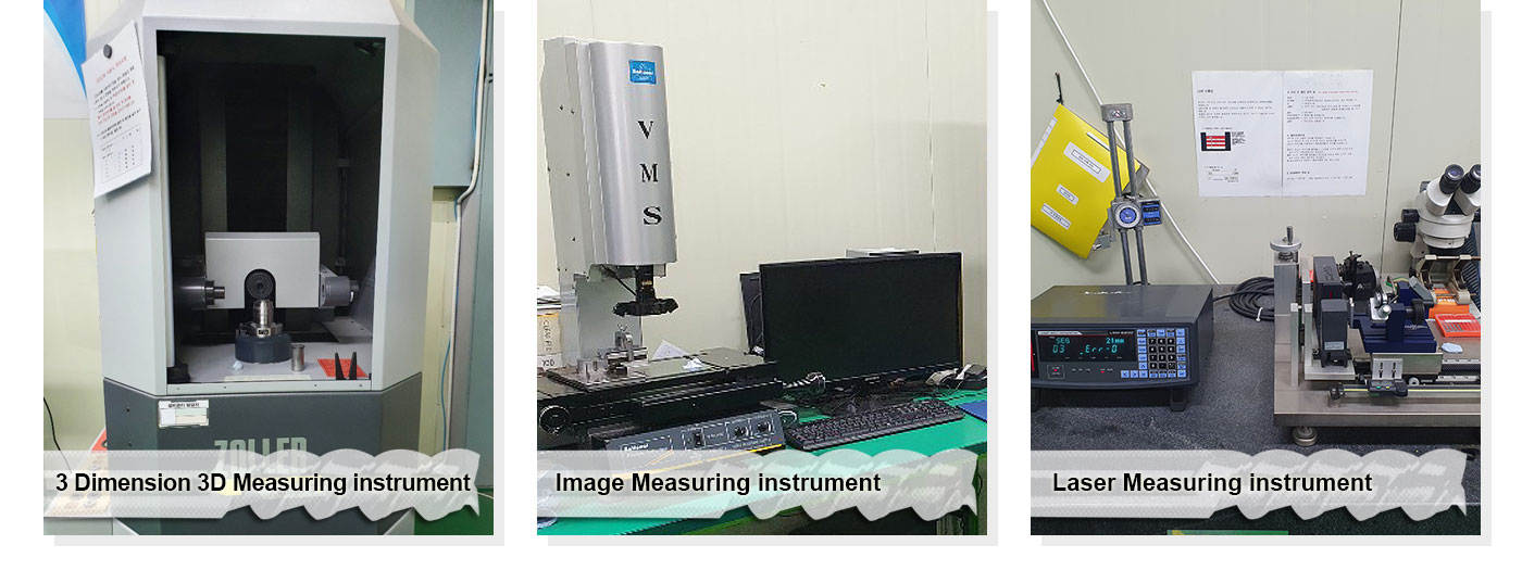 公司为了提高产品质量和种类拥有多样化最尖端设备可以满足市场日益更新和研发。验证品质上本身生产设备带有激光测定器来 调节尺寸,从而除去根本的加工不良因素,成品又使用三维3D测定器、录像放大机、激光扫描测微、光学显微镜等超精密测定器进行检测(可供检测数据)。
